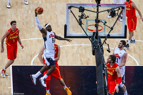> Photos from London 2012 Olympics Day 14 – Men’s Basketball Final (USA v Spain) > LeBron James makes a Slam Dunk
