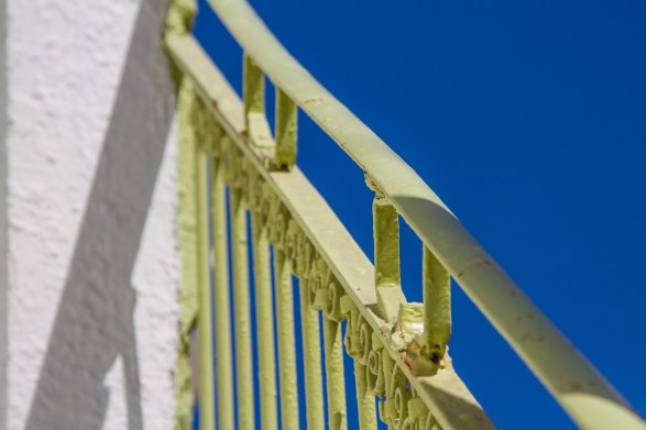 > Photos from late summer trip to Mykonos and Santorini > Railing and blue sky, Mykonos Town