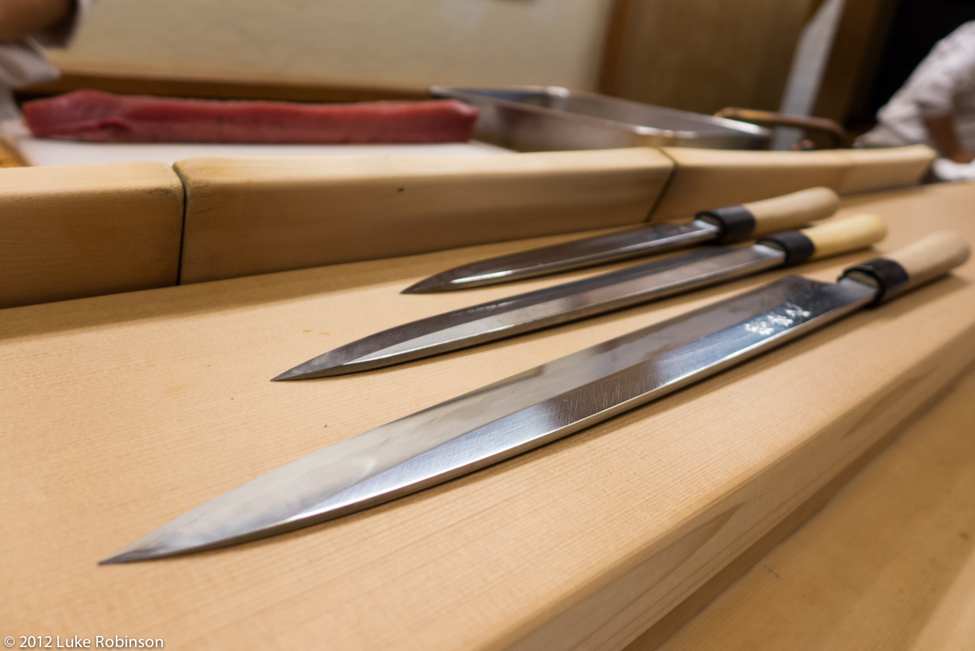 We had to run off after sampling the morning’s temple visits, because we had a lunch date with one of Kyoto’s finest kaiseki ryori / haute cuisine restaurants, Roan Kikunoi. This was a stunning foodie experience, down to personalised printed menus walking you through the many exquisite courses (more on this in a later post). One of the things we were fascinated with, sitting at the bar, was the deft knifework of the various chefs, especially when slicing sashimi or trimming fillets. I asked about the knives they used, and the head chef laid out the three knives below. It turns out they all started off the same length, but that the lengths they are now are a result of five-year increments of multiple sharpenings per day. Amazing.